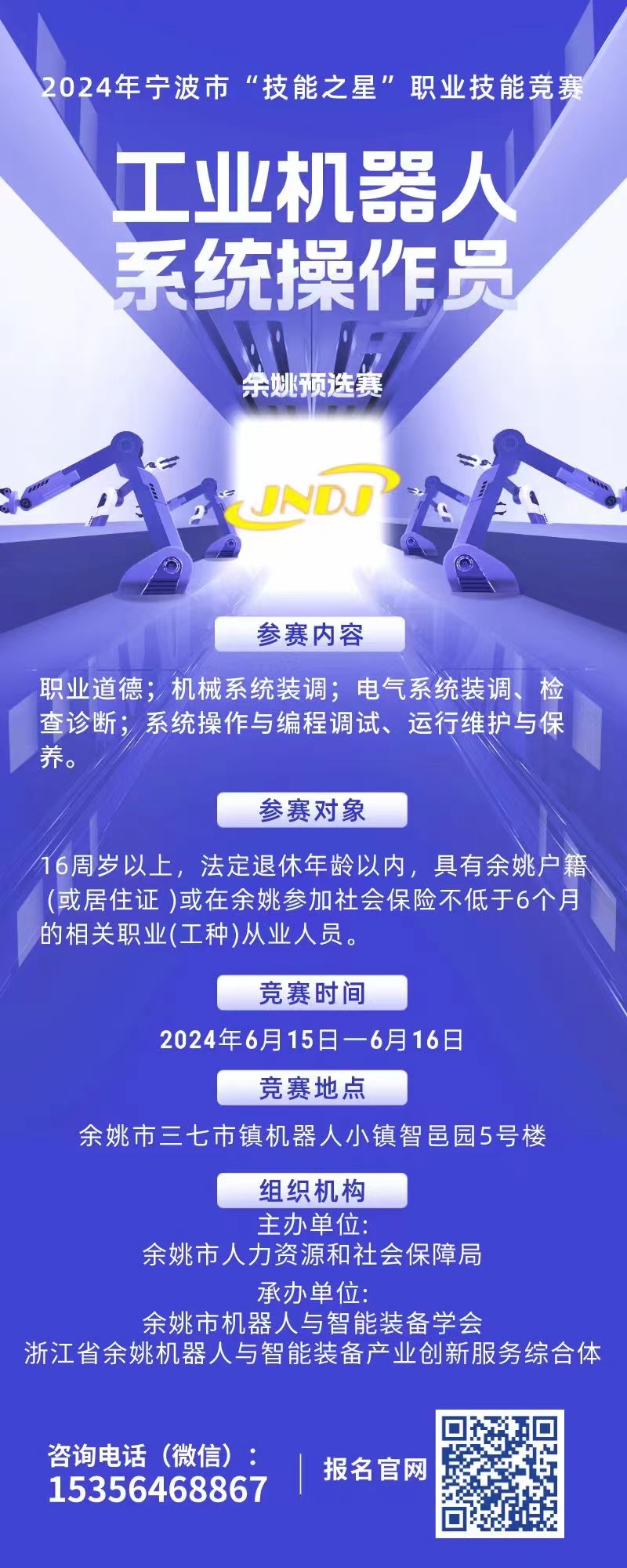 为贯彻落实习近平总书记对技能人才工作的系列重要指示精神,更好地在全社会弘扬劳模精神、劳动精神、工匠精神,激励更多劳动者特别是青年一代走技能成才、技能报国之路,加快培育一批技能精湛、素质优良、结构合理的新时代余姚工匠队伍。根据 《关于公布 2024年 宁波市职业技能竞赛计划的通知》(甬 人社办发 E2024〕 6号 )、 《关于公布 2024年余姚市职业技能系列竞赛计划的通知》(余人社〔2024〕 21号 )文件精神。经研究,决定组织开展 2024年宁波市“技能之星”职业技能竞赛工业机器人余姚预选赛。
